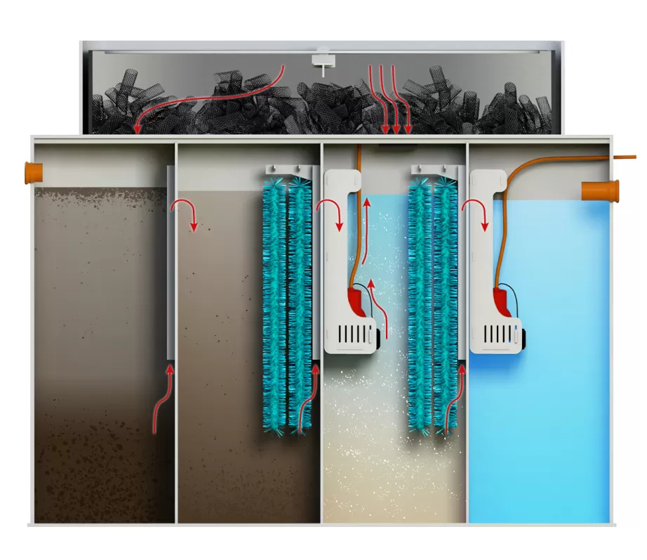 - Во 2 и 3 камерах установлены ершовые загрузки, которые дополнительно очищают воду от взвешенных частиц.